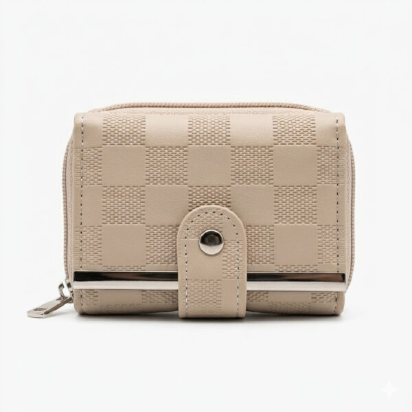 Billetera dama Jane & Berry en tono beige con textura cuadriculada, cierre de cremallera y broche a presión. Compacta, elegante y perfecta para el uso diario.
