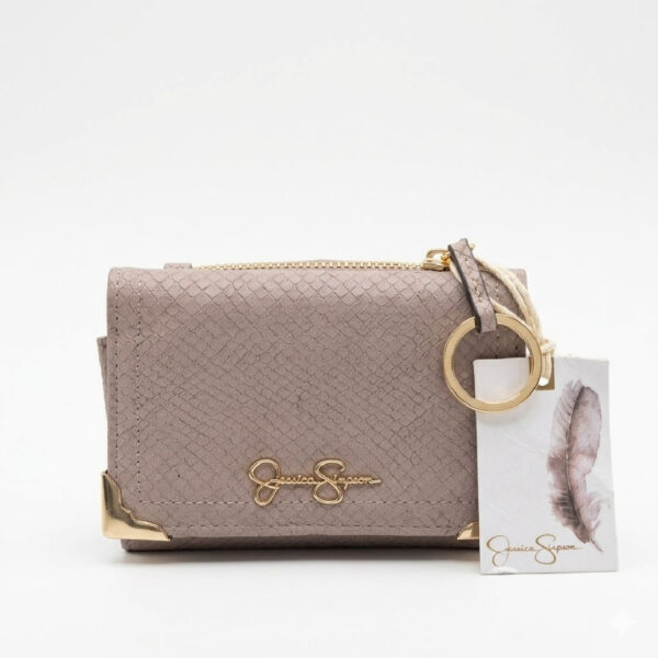 Billetera dama Jessica Simpson en tono nude con textura animal print, herrajes dorados y llavero argolla. Estilo chic y femenino para llevar tus esenciales con glamour.