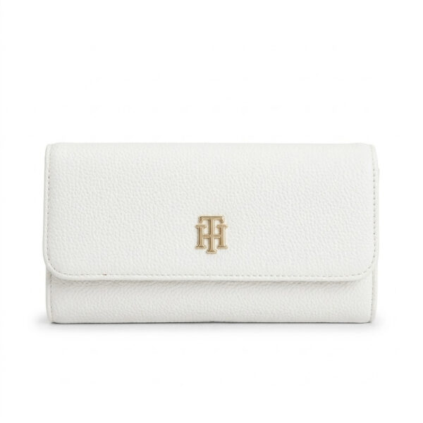 Billetera dama Tommy Hilfiger blanca larga con textura pebbled, solapa y medallón TH dorado. Pura elegancia minimalista con el sello de una de las marcas más icónicas del mundo.