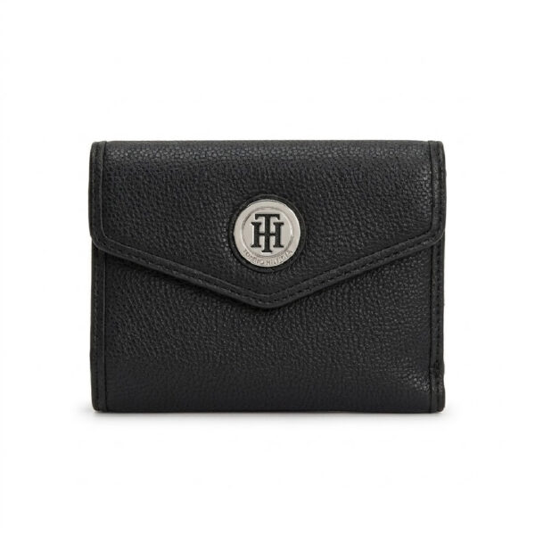 Billetera dama Tommy Hilfiger negra corta en formato sobre con textura pebbled y medallón TH plateado. Clásica, compacta y con la elegancia atemporal que distingue a la marca.