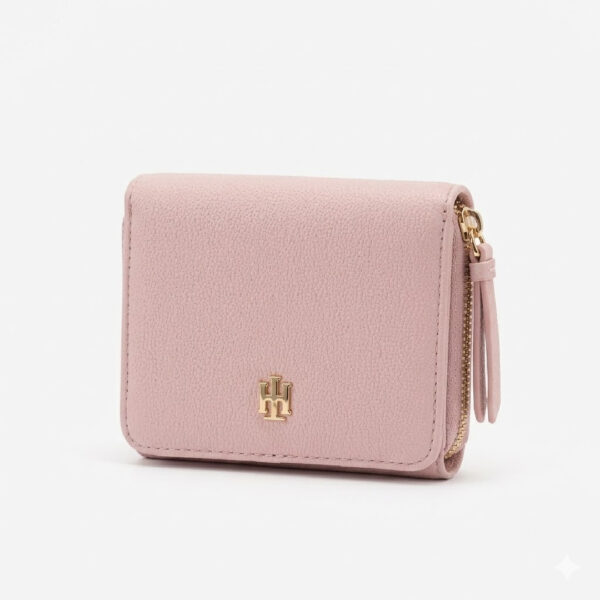 Billetera dama Tommy Hilfiger rosada en formato cuadrado con textura saffiano y logo dorado. Clásica, compacta y con el sello de una de las marcas más icónicas del mundo.