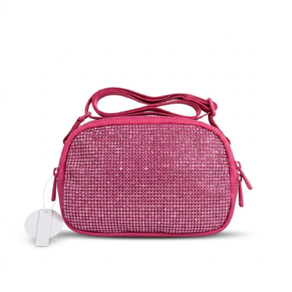 Bolso crossbody Studio NYC rosado cubierto de brillantes con doble cremallera y correa ajustable. Deslumbrante, atrevido y perfecto para brillar en cada salida nocturna.