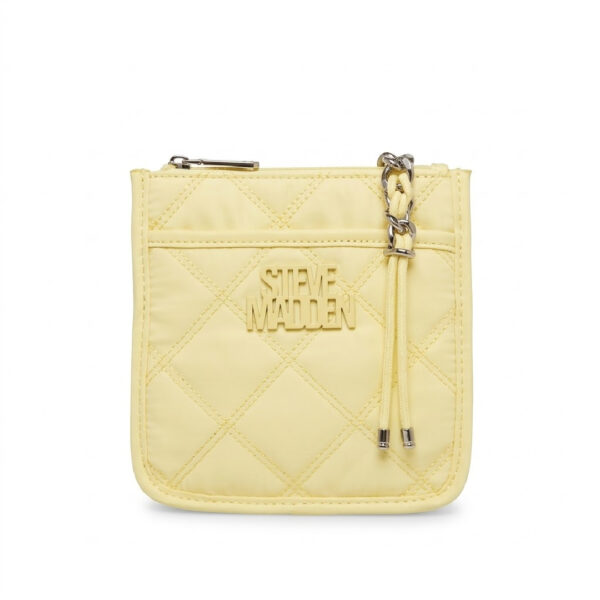 Bolso dama Steve Madden amarillo pastel con acolchado quilted, logo metálico dorado y doble cremallera. Fresco, trendy y perfecto para darle vida a cualquier look de temporada.