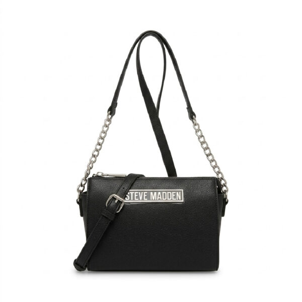 Bolso dama Steve Madden negro con textura saffiano, logo en placa plateada y correa combinada de cadena y cuero. Urbano, versátil y con ese edge sofisticado que caracteriza a la marca.