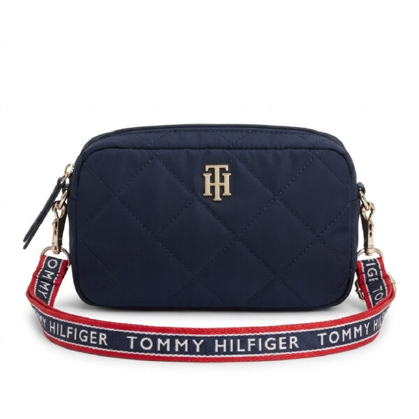 Bolso dama Tommy Hilfiger azul oscuro en tela acolchada quilted con logo TH dorado y correa estampada de la marca. Icónico, versátil y con el estilo preppy que enamora a primera vista.