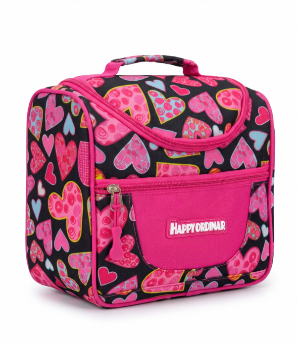 Lonchera estampada BX200 con diseño moderno de corazones en colores vibrantes, perfecta para uso escolar o diario. Cuenta con amplio compartimento principal con cierre en cremallera que permite conservar y transportar alimentos de manera organizada. Incluye un bolsillo frontal adicional para guardar utensilios o snacks pequeños. Su asa superior facilita el transporte, mientras que su material resistente asegura durabilidad y fácil limpieza. Ideal para niños y jóvenes que buscan funcionalidad con estilo.