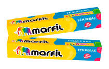 Témperas surtidas Marfil en caja de 6 colores, ideales para uso escolar y actividades artísticas. Colores vivos, fáciles de aplicar y de buena cobertura.